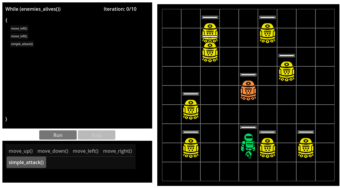 You have five simple commands: four directional movements and one attack. Click each of them to insert them into your code. You can remove unwanted lines by clicking on them if you want to refactor your logic.